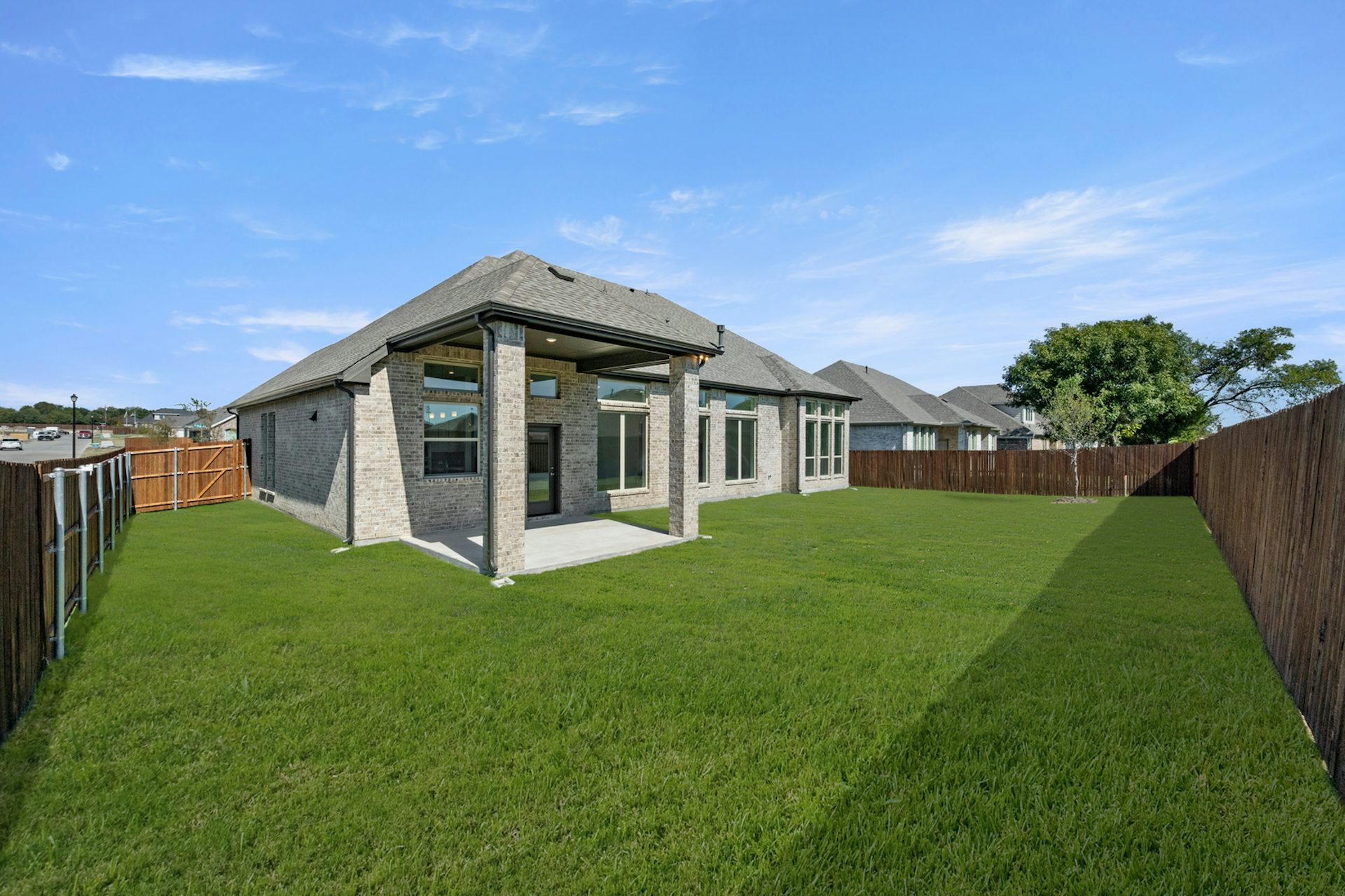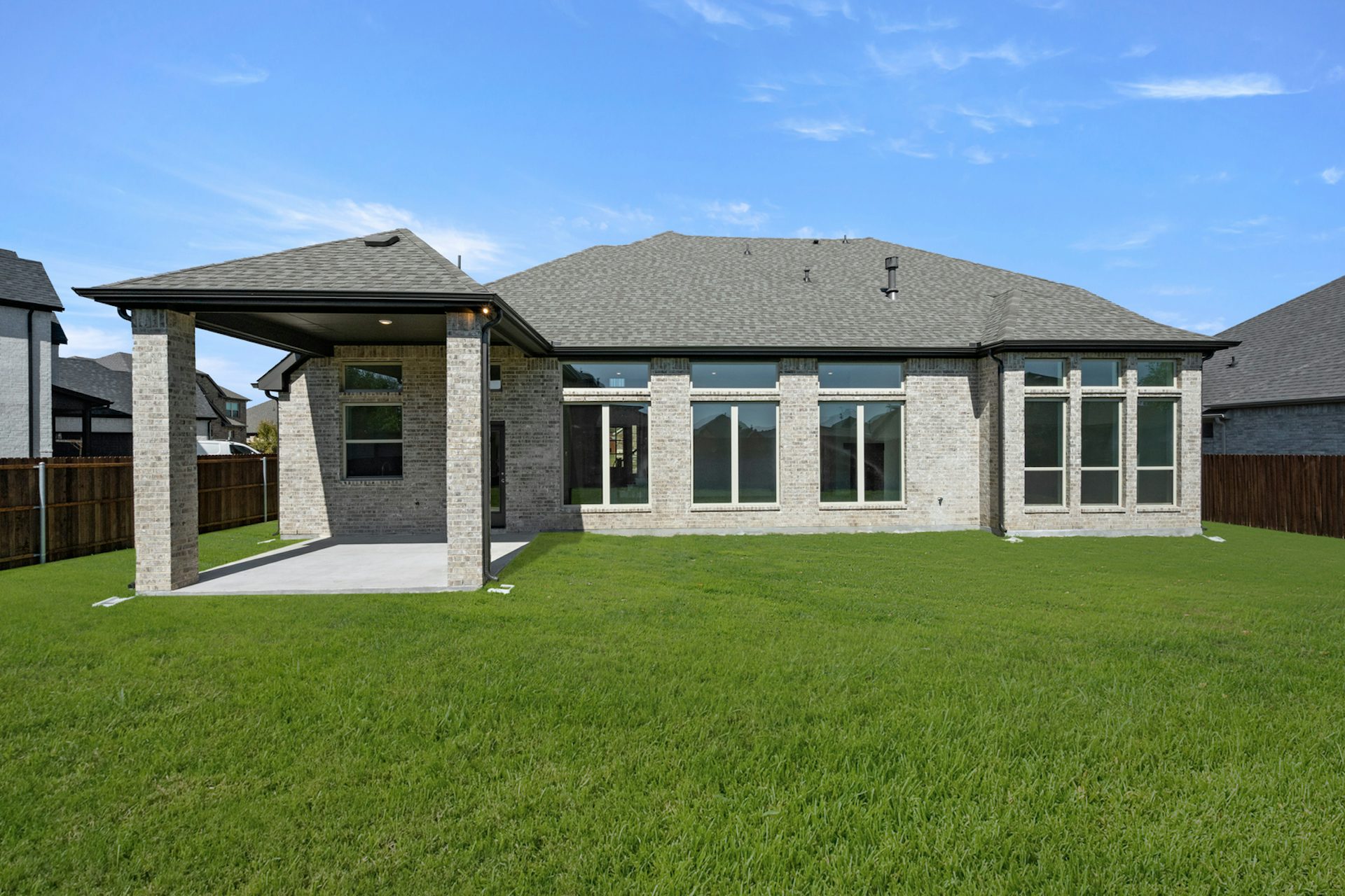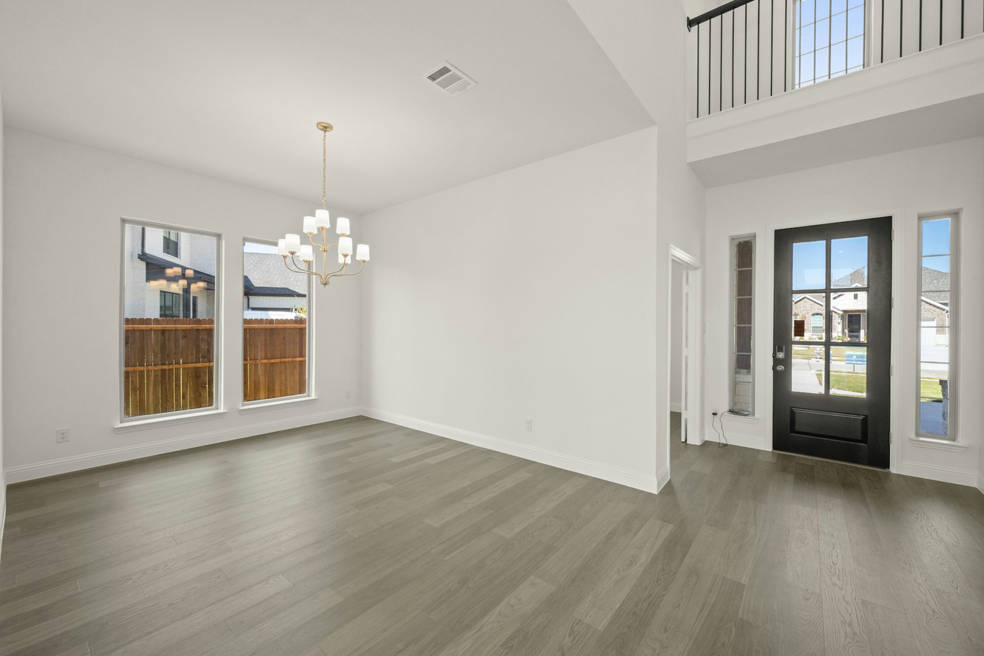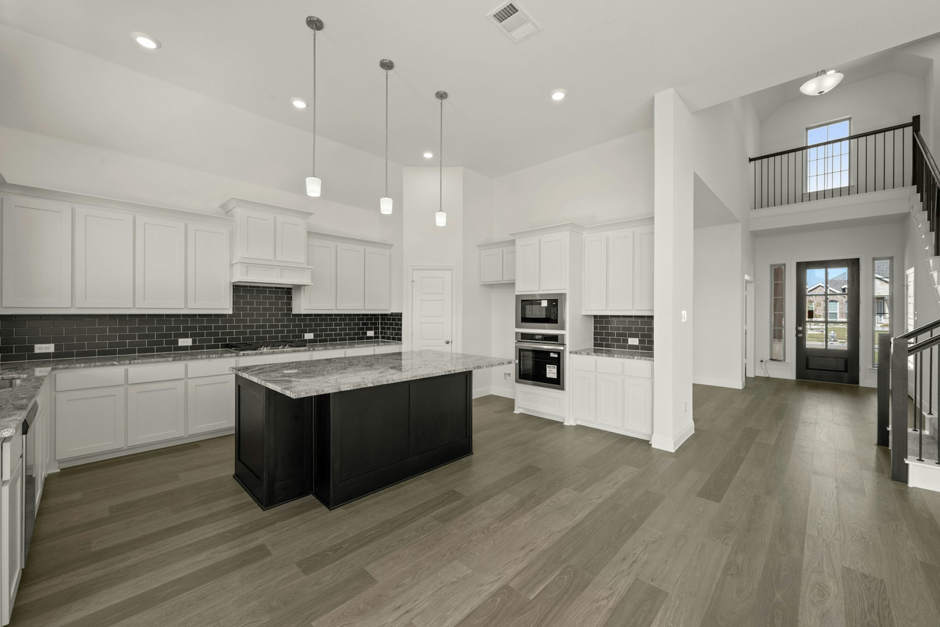 The Manor's extended covered entry and impressive foyer with soaring two-story ceilings flow into the family room, with a view of the sought-after covered outdoor living beyond. The spacious family room opens to the breakfast nook and kitchen for open floor plan living. The kitchen is complete with a large center island, plenty of cabinets and counter space, and a large walk-in pantry. The owner's suite is finished with a 12' ceiling and a large walk-in closet. The luxe owner's bathroom is complete with separate vanities, a glass-enclosed shower, a free-standing tub, a linen closet, and a private water closet. A secluded guest suite is located on the first floor and features a large walk-in closet and a private full bathroom. The second floor holds three bedrooms, all with walk-in closets, one shares a full bath with separate vanities. An oversized game room allows for plenty of space for kids to spread out to play or work. Additional highlights include a private study, dining room, powder bath, laundry with sink, a built-in desk in the kitchen, and additional storage throughout.
