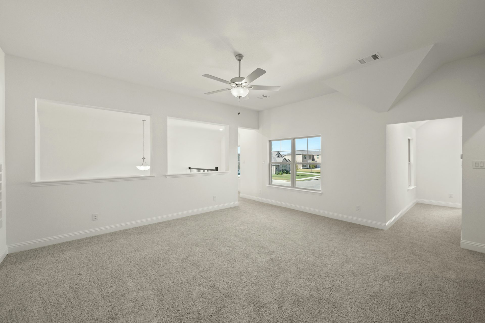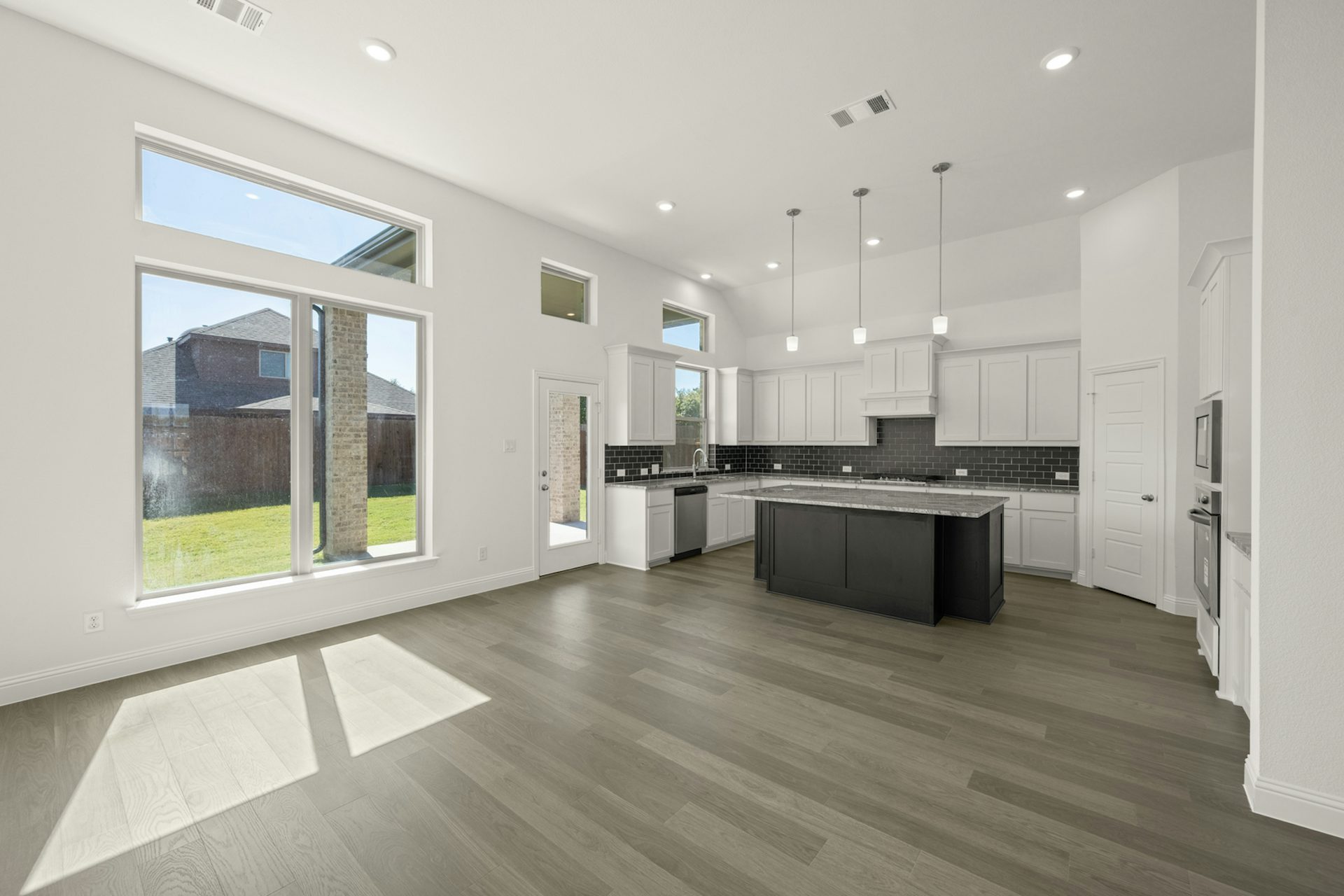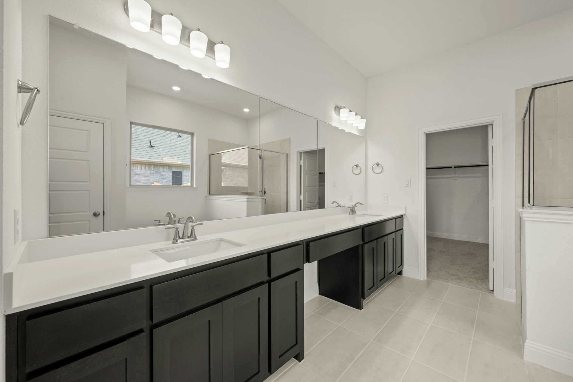 The Manor's extended covered entry and impressive foyer with soaring two-story ceilings flow into the family room, with a view of the sought-after covered outdoor living beyond. The spacious family room opens to the breakfast nook and kitchen for open floor plan living. The kitchen is complete with a large center island, plenty of cabinets and counter space, and a large walk-in pantry. The owner's suite is finished with a 12' ceiling and a large walk-in closet. The luxe owner's bathroom is complete with separate vanities, a glass-enclosed shower, a free-standing tub, a linen closet, and a private water closet. A secluded guest suite is located on the first floor and features a large walk-in closet and a private full bathroom. The second floor holds three bedrooms, all with walk-in closets, one shares a full bath with separate vanities. An oversized game room allows for plenty of space for kids to spread out to play or work. Additional highlights include a private study, dining room, powder bath, laundry with sink, a built-in desk in the kitchen, and additional storage throughout.
