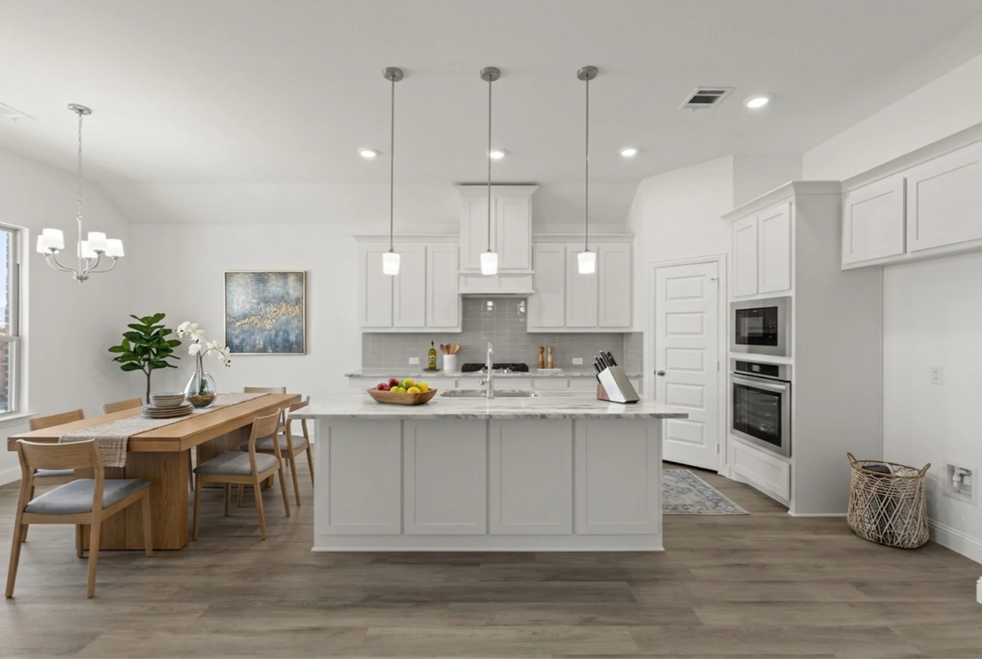 Welcome home to the Magnolia, a one-story, three/four-bedroom plan with stunning curb appeal, highlighted by a stone elevation. Inside, enjoy a light and bright space with white kitchen cabinets, marble countertops, and cozy luxury vinyl plank flooring. The open floor plan seamlessly connects the kitchen, family, and dining rooms. The owner's suite includes a spacious bedroom, bath with dual vanities, a walk-in shower, and a luxurious closet. Situated on a quarter-acre corner lot, the home also features an extended covered patio.