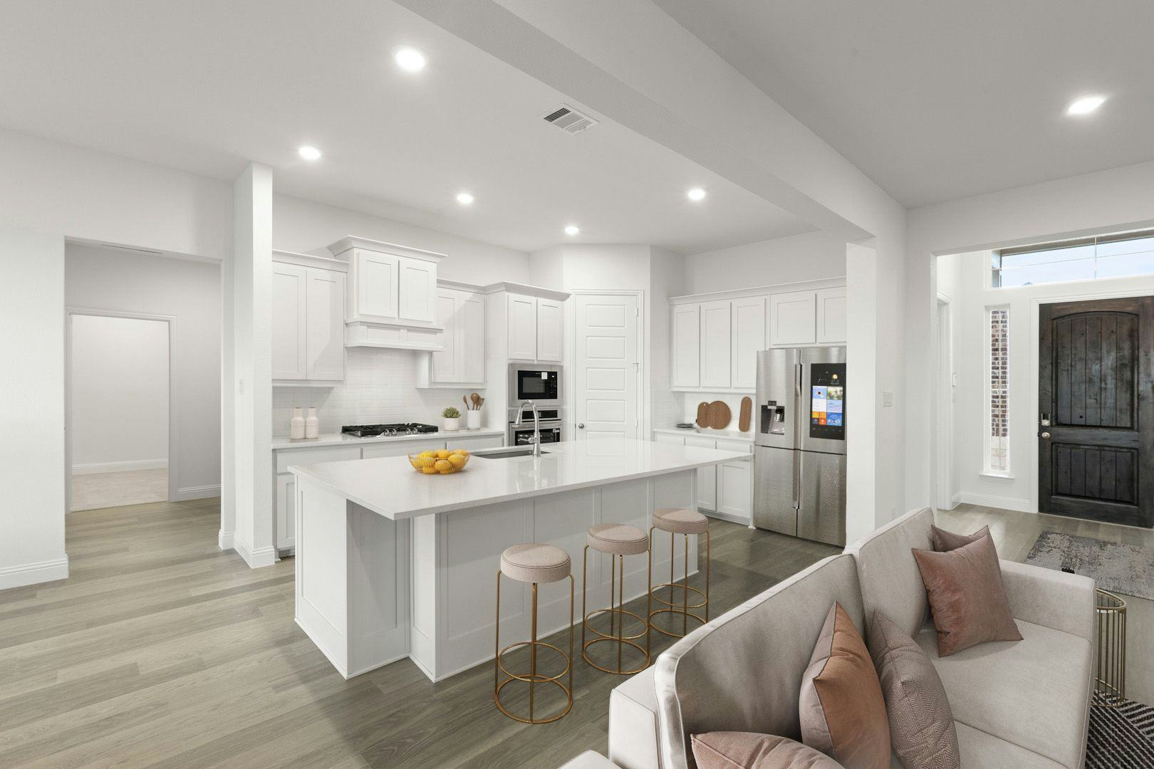 Welcome home to the Brady, an expansive one-story home designed with everything you need. This open-concept floor plan features a gourmet kitchen, spacious family room, and breakfast nook, all highlighted by light and airy finishes, white shaker cabinets, and white quartz countertops that contrast beautifully with warm wood floors. The owner’s suite offers a deluxe bathroom with dual vanities and walk-in closets, while a front-facing study provides the perfect space for working or schooling from home. You’ll also enjoy a media room for entertaining, a 3-car side-entry garage, and a huge covered patio with an outdoor fireplace—ideal for relaxing on your one-acre homesite.
