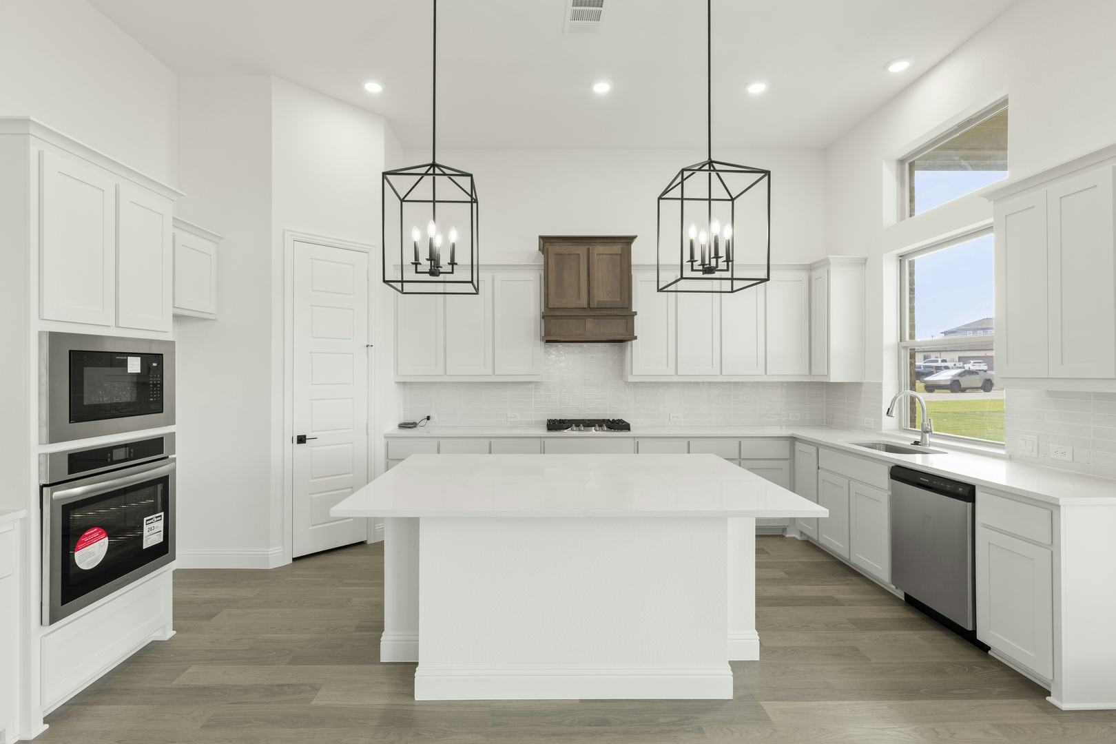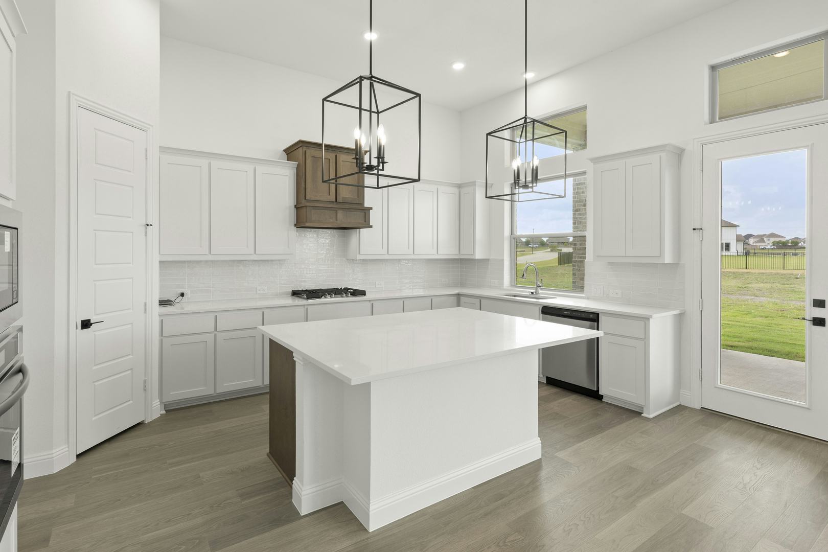 The Manor offers a spacious, open-concept design with soaring two-story ceilings in the foyer leading to the family room, breakfast nook, and kitchen. The kitchen features a large island, quartz countertops, ample cabinetry, and a walk-in pantry. Light wood flooring enhances the bright and airy feel throughout the main living areas. The owner's suite includes a bay window, a luxurious bath with separate vanities, a free-standing tub, a glass-enclosed shower, and a large walk-in closet. A private guest suite with a full bath and walk-in closet is also on the first floor.