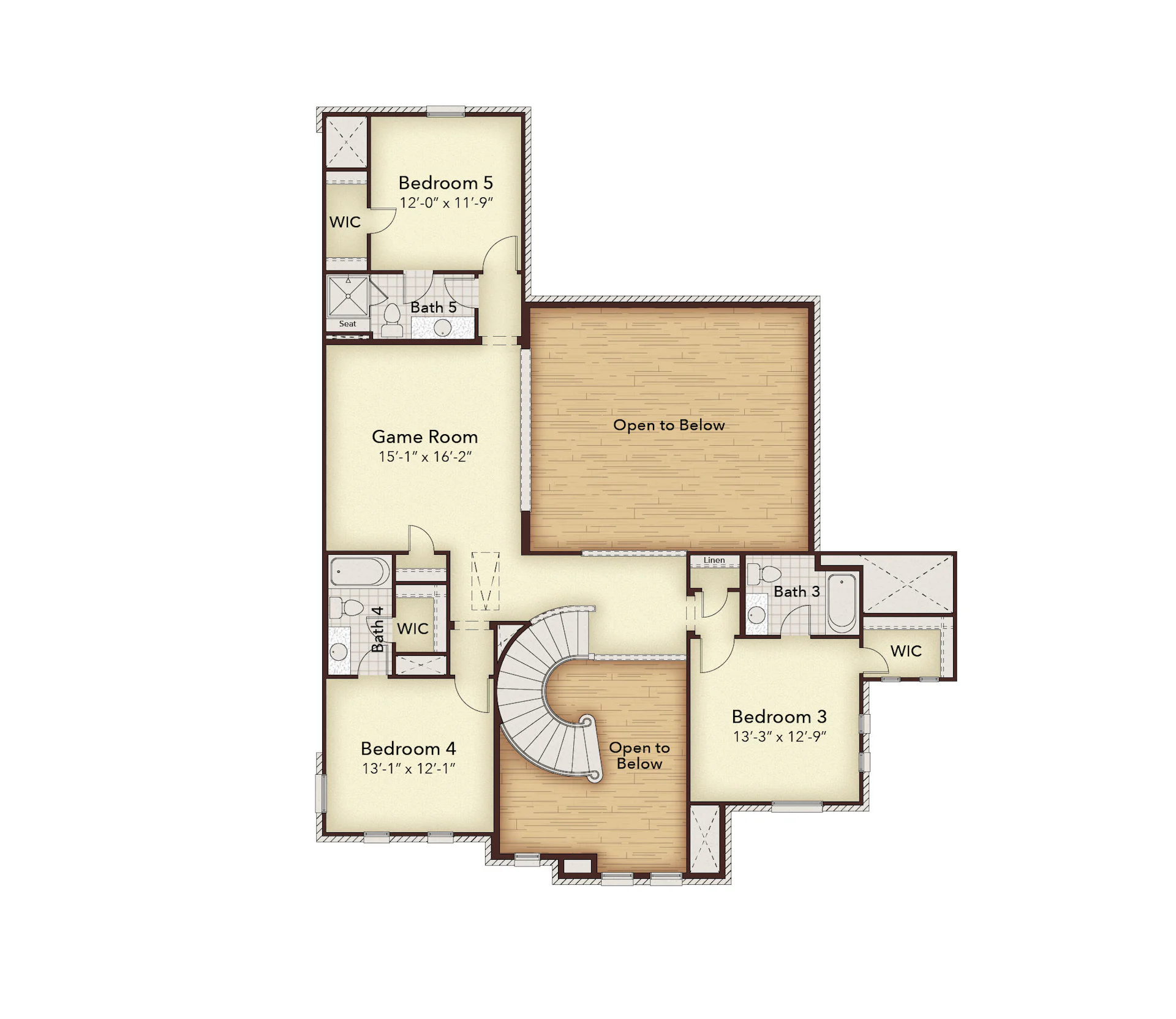 The owner’s suite is thoughtfully positioned opposite a secondary bedroom and full bath, creating a private retreat. Upstairs, you'll find a spacious game room and three additional bedrooms—each with its own full bath.